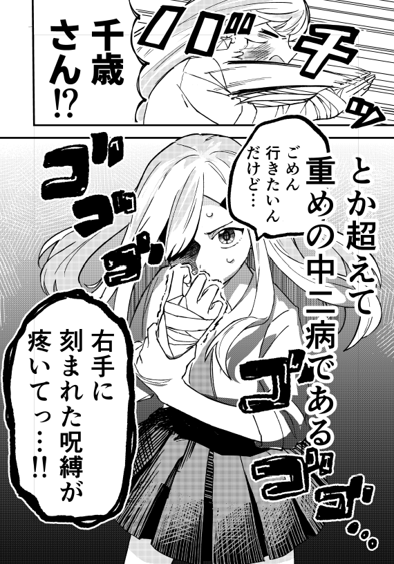 オタクに優しいギャルが、真面目なメガネのクラスメイトから勉強を教わり距離を縮めて…? という王道なストーリーかと思いきや、まさかのギャルが中二病で、そんなギャルが超能力者じゃないかと疑っていた田中くんは、本当に能力者という展開に驚かされました。王道に見せかけてオリジナリティある魅力的なキャラクターが描けていました。また、「ギャル」「中二病」「能力者」という派手な設定に見えますが、ひたむきに勉強を頑張る千歳さんと、千歳さんにうまく勉強を教えたいと思う田中くん……という、設定に頼らないキャラの魅力を描けていたのが素晴らしかったです。絵柄もとても可愛く、全ページ安定して描けていました。全身のデッサンはたまに崩れてしまうところがあるので、ぜひ色々な構図で練習してみてください。特に俯瞰は要練習です。絵が終始非常に安定している一方、髪の毛の柔らかさ、女性の身体の関節や服のしわなどは要練習です。線の太さを調整して描きこんでいけると良いと思います。