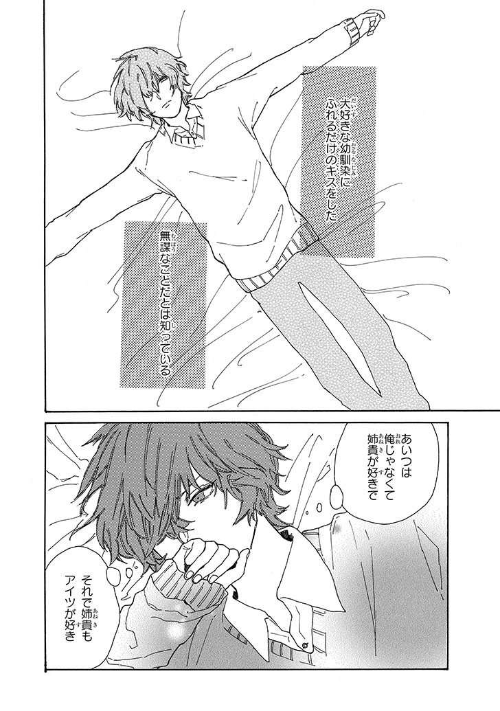 男子高校生同士、しかも幼馴染は、自分の姉のことが好き…。困惑した幼馴染はその日は部屋を去るが、後日ちゃんと、「お前の姉ちゃんとつき合ってる。気持ちには答えられない」と真摯な返事をくれる。その時の彼の悲し気な表情を見て、「冗談に決まってんじゃん」と言ってしまう主人公…。そして、「お前がそう言うなら」と受け止めてくれた幼馴染…。そして時は過ぎ――。