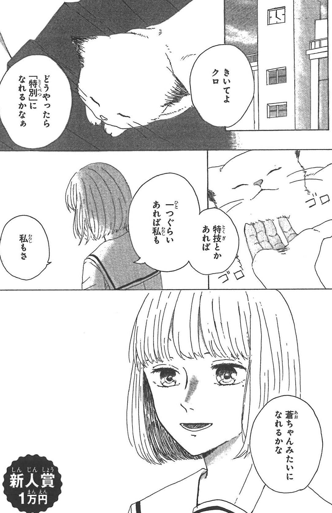 隣のクラスの男子が「狸だった!」という気になる冒頭から始まる楽しい作品。とくに狸のキャラクターが外見と中身ともに可愛く、この狸の恋を応援したい!と素直に思わせてくれました。狸の絵柄は、ふわふわの毛並みを表現するために細かな斜線で描きこまれていて丁寧で繊細。狸のキャラはころころと変わる表情が雄弁で、切ない心情がストレートに伝わってきました。惜しいのは、主人公が狸の「恋を手伝う」といったものの傍観者になってしまい、クライマックスで活躍するシーンが少なくなってしまった印象。今回は狸の恋をじっと見守る立ち位置でしたが、次回は主人公が相手役に働きかける(=読者が一緒に体験できる)お話に挑戦してみてください。