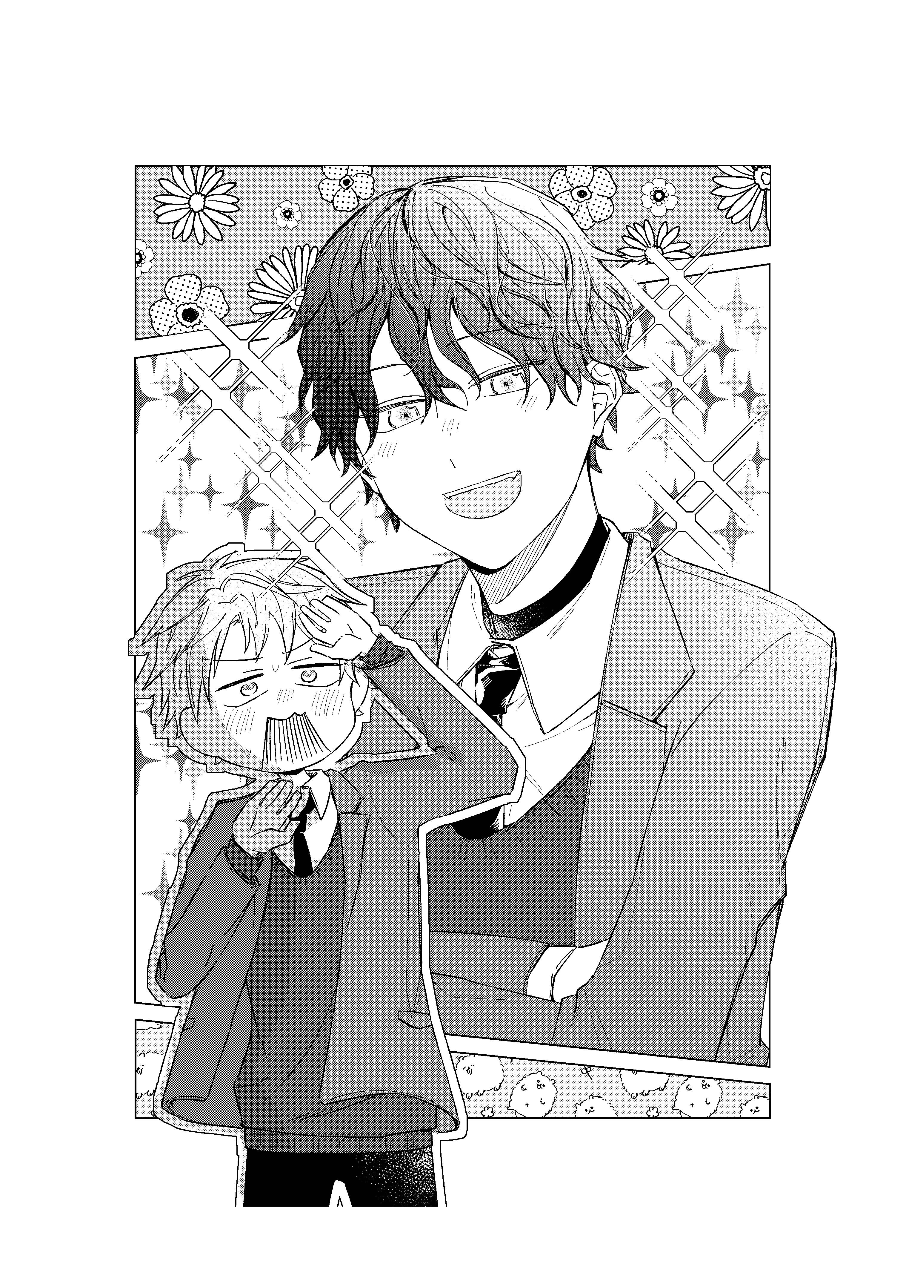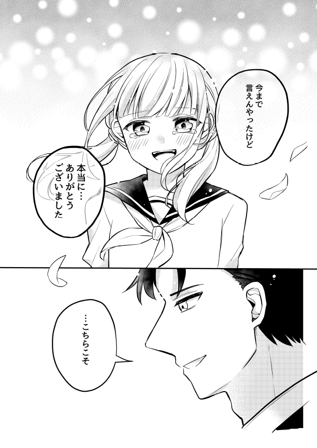 がストーリーと合っていて素敵でした。トーン使いも今時で可愛らしく華やかです。一方で基礎的な画力はレベルアップが必要です。服のシワや身体の構造などのデッサンをしっかりしましょう。背景ももう少し頑張ってみてください。高校生らしい一生懸命な二人のキャラはとても微笑ましく、嫌味がないので読んでいて自然に応援したくなります。そのセンスも素晴らしいです! 西鬼君のキャラの付加価値を盛り上げるだけ盛り上げて、実は関西弁の陽気なキャラだった…という展開も落差があり面白かったです。ただ、その後のオチが弱かったのは残念。あるあるにならないよう気を付けつつ、しっかり盛り上げましょう。