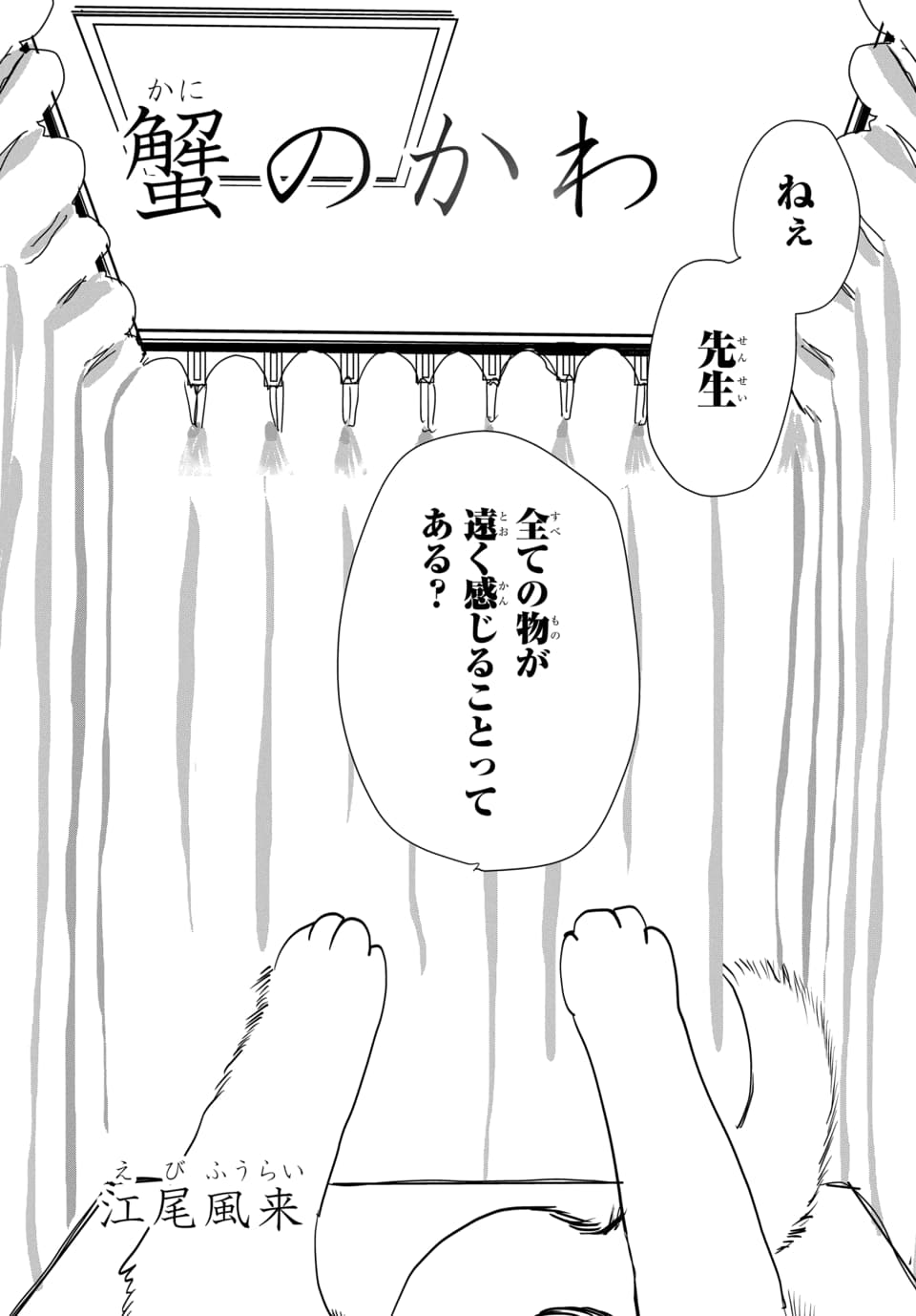 言葉選びや、カメラの切り取り方、物語の展開のアイデアなど、各所にわたさんの個性的なセンスが光っていました。特に最初のページの始まり方が圧巻です。仕切られたベッドの中、一人称視点で動物らしき手としっぽが見えて「一体どんな状況…?」と思わず気になってしまう画面になっています。その上で、「ねぇ先生 全ての物が遠く感じることってある?」と考えさせる台詞があり、先の予想が出来ないワクワク感がたっぷりで思わずページをめくりました。物語の中に引きこむ力のある言葉や絵がずっと続いていて、「猫になった」と話す灰田に向かって「じゃあズワイガニにもなれる?」と返す先生の会話などもとても素敵でした。また、ズワイガニという突飛に見えるモチーフが、最後は心の脱皮という物語のテーマに絡んでいたり、意味のある設定選択になっていた点も印象的。今後の課題は画力です。線や塗りが安定していないため、雑に見えてしまうのが勿体ないです。丁寧に描くことを意識してみてください。